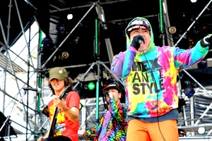前日を遥かに越える酷暑となった2日目。この日も朝から入場ゲートでメンバー3人が挨拶し、来場したファンへ感謝の気持ちを伝える(毎年恒例!)。そしてステージではこちらも恒例の開演前にラジオ体操で準備万端に、と思いきや早々にサプライズが! 前日に出演していたMAN WITH A MISSIONもステージで一緒にラジオ体操。そして開演のカウントダウンを前に、TAKUMAが集まった2万人の参加者に感謝の言葉を伝える。前日のステージ終了後、積極的なゴミの自主回収をお願いしていたのだが、TAKUMAの思いをしっかりと受け止めた参加者により会場にはゴミがゼロの状態だったのだ。大勢の人間が集まる会場でゴミがひとつもない。悲しいことだが、これは全国に数ある音楽フェスの中で奇跡と言えるくらいすごいことなのだ。しかも会場のゴミ箱がいっぱいだったからと自宅や宿に持ち帰り処分する参加者もいたとか。そんな素晴らしいイベントをただの音楽イベントではなく「みんなの遊び場」と呼ぶTAKUMA、この日の会場もそんな遊び場で思いっきり遊ぶアーティスト、オーディエンスが集まった。