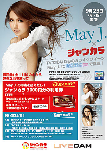 ジャンカラ(ジャンボカラオケ広場)がこの夏展開するキャンペーンは、TVでおなじみのカラオケクイーンMay J.に、LIVE DAMの精密採点DXの得点で挑戦するというもの。11曲の課題曲から好きな歌を歌って、May J.から出される課題をクリアすれば豪華なプレゼントがGETできる。