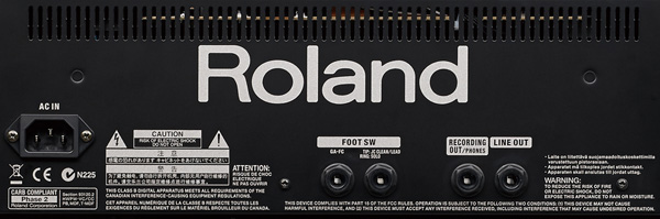 接続端子:INPUT端子(標準タイプ)、i-CUBE LINK/AUX IN端子(4極ミニ・タイプ)、RECORDING OUT/PHONES端子(ステレオ標準タイプ)、LINE OUT端子(標準タイプ)、FOOT SW(TIP:JC CLEAN/LEAD、RING:SOLO)端子(TRS標準タイプ)、FOOT SW(GA-FC)端子(TRS標準タイプ)、AC IN端子