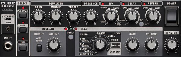 ローランドのギター・アンプ、CUBEシリーズは、コンパクトなサイズなのに驚くほどパワフルなサウンドが出せることで、発売以来高い人気を保っている。そのCUBEシリーズがラインナップを一新、CUBE-GXシリーズとして新たに4製品が投入された。新たに登場したのは、20Wの「CUBE-20GX」、40Wの「CUBE-40GX」、80Wの「CUBE-80GX」、それに乾電池駆動も可能な小型の「MICRO CUBE GX」だ。いずれも、リアルなサウンドに定評あるCOSM(アンプの物理的特性をモデリングするローランド独自の技術)によるアンプ・モデルや各種エフェクトを内蔵し、堅牢な造りやパワフルなサウンドといった、従来のCUBEシリーズの特徴をそのまま引き継いだうえ、COSMアンプやエフェクトをチューン・アップしている。また機能を絞り込んだことで操作性も向上し、よりライヴ向きのアンプとなった。さらにiPhone/iPadアプリとの連携機能も追加され、ライヴはもちろん、様々な楽しみ方ができる製品となっている。より研ぎ澄まされたCUBE-GXシリーズ、今回はそのフラッグシップ製品である「CUBE-80GX」を使ってみた。