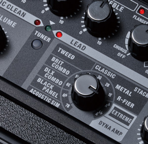 旧モデル同様、CUBE-80GXにもチューナーが内蔵されている。このチューナーは、弦を1つずつ指定してチューニングするマニュアル・チューニングと、弾いた音にもっとも近い音程を自動的に判別するクロマチック・チューニングの両方の使い方が可能だ。マニュアル・チューニングの方法は、コントロール・パネルのTUNERボタンを押し、アンプ・タイプを選択するつまみでチューニングする弦の音程を指定すればOK。弾いた音程を判別して、緑のLEDとその左右にある赤のLEDで知らせてくれる。音程が高い時は右の赤LED、低い時は左の赤LEDが点灯するので、中央の緑だけが点灯するようにチューニングすればよい。一般的な開放弦、6弦のEから1弦のEまでのほかに、半音下げたチューニングのための6弦の開放のE♭や5弦解放のA♭とA♭♭、さらには7弦ギター用の下のBまで用意されているから、様々なチューニングに対応可能だ。TUNERボタンを長押しすると、クロマチック・チューニングを行なえる。チューニングが大きく外れていないときの微調整は、こちらが便利だ。