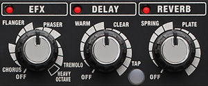 内蔵のエフェクトは、EFX、DELAY、REVERBの3つのつまみで操作する。EFXにはコーラスとフランジャー、フェイザー、トレモロとヘビー・オクターブの5種類がまとめられていて、つまみの位置によってこれら5つのうちの1つのエフェクトを使うことができる。つまみのもっとも左から時計の9時くらいの位置までがコーラスで、そこから12時までがフランジャー、2時半くらいまでがフェイザー、4時までがトレモロ、最後の5時あたりがヘビー・オクターブとなっている。それぞれのエフェクトの位置で、つまみを右に回していくとエフェクトが深くかかり、最大になった位置から先が次のエフェクトに切り替わる、という使い方になる。