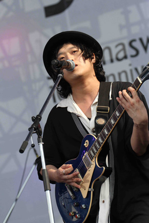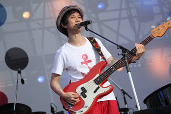 元ちとせが登場。昨年、一足先に10周年を迎えた元ちとせは、野外のロケーションにぴったりの楽曲「晴ときどき曇」「水色のスカート」を。どちらもミディアムテンポの爽やかなスキマスイッチの楽曲に元ちとせの声が重なり、ロックな空気から一転、癒しの空間へと変わっていく。「水色のスカート」は、パーカッションにあらきゆうこ迎え、アコースティック編成でのステージとなった。この曲のために「今日の朝、衣装を合わせてきた」という元ちとせとあらき。それぞれ赤、黄色、ピンクと、青空に映えるカラフルな衣装が、より一層華やかさを演出する。
