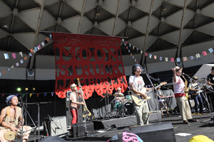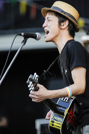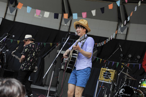 豪快な太陽の日差しが暑く降り注ぐ会場内には、メンバーとその仲間達がデザインと創作を担当した場内装飾や、子どもたちの遊び場(こどもじゃんぼりー)、また飲食ブースなどが揃い、開演前から多くのオーディエンスが楽しんでいた。まず、開会の挨拶として登場したのがイベント2日前に出演が決まったというTOMOVSKY(今年4月に開催された「CAPITAL RADIO ‘13」での対バンで交流が生まれたとか)。もちろん挨拶だけなんてことはなく、メドレーでライヴも披露。しかも1曲目からフラワーカンパニーズの名曲「深夜高速」をカバー。しかも現場に到着したばかりの鈴木圭介まで登場し、他人の名曲を1曲目に持ってくるその無邪気さに会場は初っ端から盛り上がった。