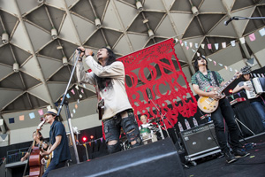 イベントも中盤に入りステージでは夏らしくスイカ割り大会が行われ(出演者によるミニコントあり!)、続くフラワーカンパニーズが夏の暑さをさらにぐっと熱くするステージで楽しませてくれた。「深夜高速」からスタートしたステージは高ぶる感情がどんどんと燃え盛り、客席へ開放されるように広がっていく。アニメ「宇宙兄弟」の新エンディングテーマとなった「夜空の太陽」をライヴ初披露! ゴリっとした硬派なロックンロールサウンドはライブバンドの凄みをより感じる。ラスト「真冬の盆踊り」、定番のヨサホイにDOBERMANを始め出演者が続々登場し、祭りの盛り上がりをより高めていった。