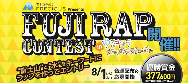 コンテスト開催に伴い、「富士山」と「水」というキーワードをリリックに入れ込んだラップを大募集。年齢、国籍、個人・グループ、プロ・アマ不問。事前に厳正なる審査・選考を行ったうえ、上位3候補には、9/28(土)の<ゆるキャラグルメフェスティバル in YOKOHAMA>のステージにて、パフォーマンスを披露してもらう。