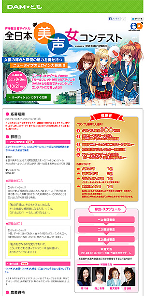 課題は「アテレコで応募」(必須)と「歌で応募」(任意)の2種類。「アテレコで応募」は、スマートフォンゲーム Ameba『ガールフレンド(仮)』の課題朗読文章を「DAM★とも」動画で撮影することで行う。「歌で応募」は、「DAM★とも動画」と「DAM★録音」対応曲から自由に選択できる。