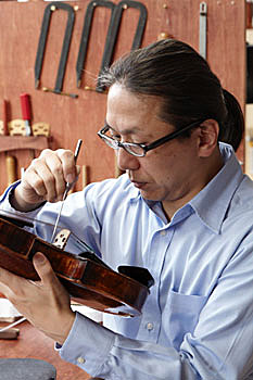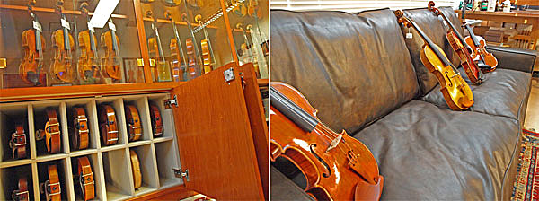 技術者の顔が見える「三田バイオリン専門店」で、愛用中の楽器のこと、展示商品のことなど、弦楽器について何でも相談してみよう。