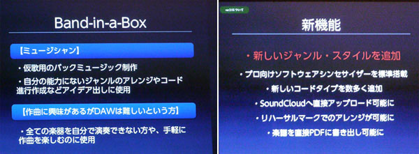このほか、ソフトウェアシンセサイザーとして「SampleTank」の特別版が収録されていること、新しいコードタイプの追加、SoundCloudへの対応なども紹介。ミュージシャンにうれしいのが、リハーサルマークでのアレンジが可能になったこと。従来はAメロ/Bメロ/サビと区切ったあと、2番を作ったり、曲の構成を変えるにはすべてをコピーする必要があった。しかし、新バージョンではAメロ/Bメロ/サビ/Aメロ/サビといったようにカンタンに並び替えができるようになっているという。ラインナップは、ジャンル・スタイルの数が異なるBasicPAK、MegaPAK、EverythingPAK。BasicPAKとMegaPAKにはガイドブック付きを用意する。いずれも機能は同じなので、より幅広いスタイルが欲しいなら上位グレードを選択することになる。