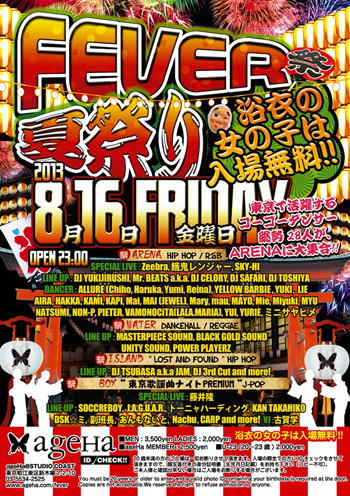 お盆休みの真っただ中に開催となる<FEVER 夏祭り>だが、総勢28人ものGO GO DANCERたちが、メインフロアのARENAに大集合、セクシーに華やかにフロアを彩ることだろう。また屋外のWATERは、ageHaの夏の醍醐味プールサイドレゲエだ。BOXは前回異様な盛り上がりを見せた<東京歌謡曲ナイト PREMIUM>が開催となる。