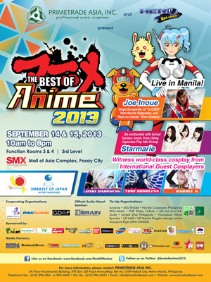 9月14日、15日にフィリピンで開催される<Best of Anime>。Starmarieは14日に出演予定で、オープニングセレモニー、握手会、ライブ出演を予定している。詳しくは、オフィシャルサイト、またはイベントページにて。