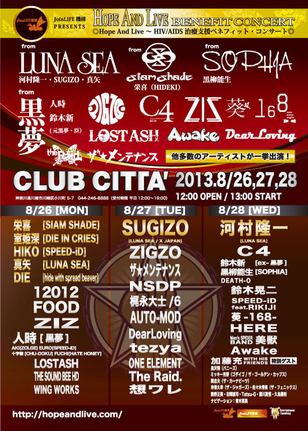河村隆一、SUGIZO、真矢、黒柳能生(SOPHIA)、栄喜(SIAM SHADE)ら出演のHIV/AIDS治療支援コンサート、開催迫る