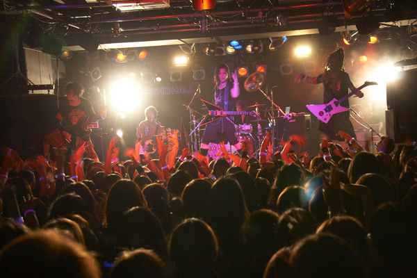 一転、「イキナリ×××」「記憶の匣」を並べてデジタル/エレクトロな側面を垣間見せるが、それも彼らが持つ引き出しのホンの一部分。サイレン鳴り響く中フラッグを振って拡声器から歌を放つ「773H」、“Crack!”“Six!”とフロアと掛け合う「CODE NAME”666”」、サウンドプロデュースを務めるSHIGE ROCKS(G)&MSTRで激烈なハモりをカマす「Brilliant Life」と、バラエティ豊かなメニューに一瞬たりとも目が離せない。