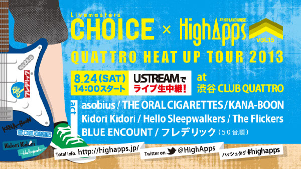8月24日(土)渋谷CLUB QUATTROにて開催される<Livemasters CHOICE × HighApps “QUATTRO HEAT UP TOUR 2013”>のUstreamでのライブ生中継が決定した。
