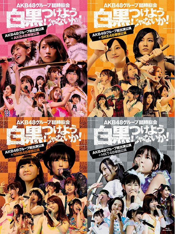 またDVD&Blu-ray『AKB48グループ臨時総会 ~白黒つけようじゃないか!~』は、AKB48、SKE48、NMB48、HKT48による4日間6公演から、各グループの単独公演とAKB48グループ総出演(昼の部・夜の部)で構成された4種類7枚組のスペシャルBOXでリリースされる。BOXには、ライブ本編に加え、各作品ごとにコンサートの進行過程や舞台裏を記録したメイキング映像と、バックステージでのメンバーの素顔を撮影した特典映像を収録。