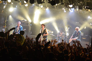 7組目はBLUE ENCOUNT。熊本発のラウドロック4人組の彼らは、先日のサマソニでもオープニングアクトに登場して観客のハートを掴んだ実力の持ち主。この日も強靭なバンドアンサンブル、耳馴染みのいいメロディと息もつかせぬテンションの高さで、フロアを熱くする。エモやパンクロック直系のストレートに情熱を伝えてくる曲調、4人の全力のプレイが、初めて観るだろうお客さんをどんどん引き込んでいく。田邊駿一(Vo/G)はMCでこのイベントがUstream中継されていることに触れ「この会場がどんだけヤバいか、映像を通してみんなに伝えたいんです!」とオーディエンスを煽る。白熱のステージだった。