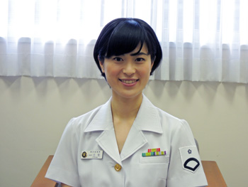 まずは腕のワッペン。これは海上自衛隊の「階級章」。隊員の階級がわかるように制服に着用するもの。この階級章で表される三宅由佳莉の階級は「3等海曹」。