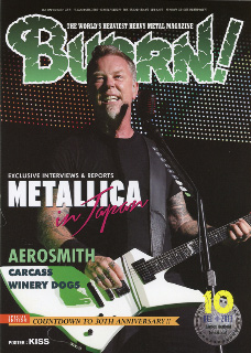 9月5日に発売される『BURRN!』誌10月号の掲載内容が8月29日正午、明らかになった。表紙/巻頭を飾るのは、先頃、サマーソニック出演のために来日していたばかりのMETALLICA。8月11日、大阪にて行なわれた全メンバーの個別インタビューが掲載されており、表紙にはジェイムズ・ヘットフィールドのライヴ写真が用いられている。参考までに、同誌が日本初にして唯一のヘヴィ・メタル専門誌として創刊されたのは1984年9月のこと。この最新号に至るまでの丸29年間を通じて“ライヴ写真による表紙”というのは初のことだという。