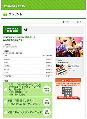 今回の企画は、ドラマやCMでおなじみの曲を歌ってみんなでもりあがろう! というもの。カラオケ店で課題曲を歌って、録音(DAM★とも録音)または撮影(DAM★とも動画)して応募すれば、「MORIAGARO」ツアーの武道館公演招待のうえAIといっしょにステージに上がることができる招待券、AI特製オリジナル「MORIAGARO」サングラス、サイン入りツアーグッズが抽選で当たる。