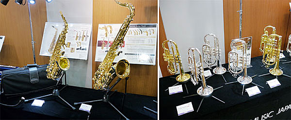 ▲発表に先立って開催された新製品内覧会ではケースや特注モデルも展示。写真左はYAS-62、YTS-62とケース。右はコルネットYCR-8335とYCR-8620のバリエーション。