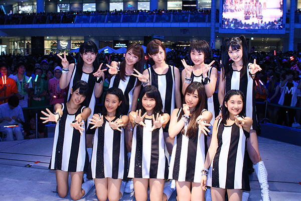最上階までぎっしりと埋まったラゾーナ川崎ルーファ広場。大歓声がモーニング娘。のメンバーを迎え入れる。モーニング娘。のイベントというと、「わがまま 気のまま 愛のジョーク/愛の軍団」リリース日に開催された池袋サンシャインシティでのイベントでは、異例の規制がかかるほどにファンが駆けつけ話題となった。今回はJR川崎駅直結の屋外のオープンスペース、かつ休日とあって、これを上回るファンが早朝から結集。その数はサンシャインシティ噴水広場で動員した約2000人の3倍となる約6000人。同広場でのイベント中に「ここからのモーニング娘。の巻き返しは“倍返し”で!」と、決意を語っていた道重さゆみだったが、今回、動員だけを見たら見事に“3倍返し”した格好だ。