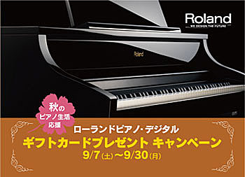 ローランドがこの秋実施するキャンペーンは、9月30日までの期間中に、対象のローランドピアノ・デジタルを購入し、キャンペーンに応募した人全員に、JCBギフトカードを、5,000円分、もしくは3,000円分プレゼントするというもの(応募締め切りは10月21日必着)。