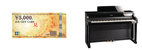 ▲プレゼントされるJCBカード(写真左)と、対象機種のローランド・ピアノ・デジタルHP507(写真右)。