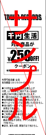 内容:「千円生活」(輸入盤・国内盤)対象商品をお買い上げ、一回のお会計につき一枚、次回お会計時にご利用いただける「千円生活 250円引きクーポン」をプレゼント