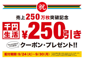 「千円生活 売上250万枚突破記念250円引きクーポン・プレゼント・キャンペーン」