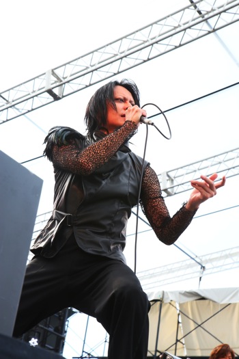 ヤガミトールがイントロでフロアタムの重いジャングル・ビートを叩きだすと、再び観客の多くが手を上げて踊り出す。「Memento mori」は、ジャングル・ビートと琉球音階が融合した実に不可思議な魅力を持った曲だ。強い日差しに照らされたここ中津川に、沖縄のムードが漂った。「Alice in Wonder Underground」では、櫻井の演劇性を感じさせる立ち振る舞いに今井のサブ・ヴォーカルが挿入され、BUCK-TICKならではのダークなポップさを際立たせる。“熱いぜ……行くぜ!”と拡声器を手にサイレンを鳴らす櫻井。曲は英詞の「ICONOCLASM」だ。1989年、オリコンチャート1位を獲得したアルバム『TABOO』の冒頭を飾るナンバーが披露される。2つのコードを行き来するフレーズを樋口豊が弾くゼマイティスのベースがリードした。妖しげに女性を誘う曲「CLIMAX TOGETHER」にステージ付近の女性ファンはすっかり魅了されている様子だ。