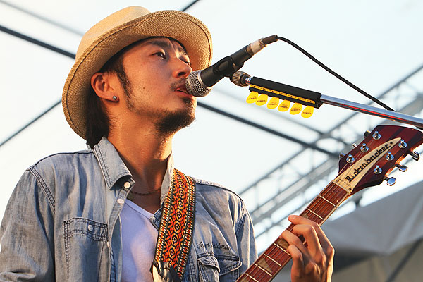 ステージが始まるジングルがなったとたん、続々と前へ前へと駆け込むオーディエンスたち。「太陽のエネルギー、自然のエネルギーを音に代えて。最高のイベントを作りましょう」、大木伸夫(Vo&G)が語りかけ1曲目「新世界」が始まる。曲の一音が鳴ったその瞬間から凄まじい爆発力で観る者を一気に引き付ける。浦山一悟(D)のリズムが真っ向からぶつかってくる「River」、タイトルのままに佐藤雅俊(B)のベースが身体の中に流れて心地よい脈拍を打つ。音郡にどっぷりと身を任せていたくなる。
