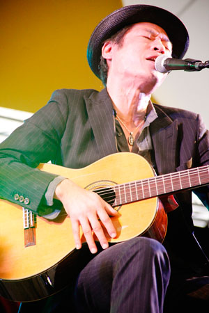 SEもなく、そのまま「キリンの首」へ進んでいく。すでにほろ酔いらしい武藤の声はしゃがれてより渋みを増している。ガットギターを抱え、ボディでリズムを打ちまくる。「パラダイス・ダンス」ではお祭り騒ぎでオーディエンスをハンズクラップで巻き込み、STINGの名曲「イングリッシュマン・イン・ニューヨーク」ではしっかりと声を聴かせ観客を酔わす。