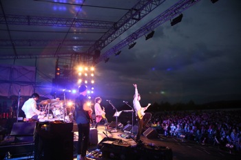 “風が気持ち良いね、こんな時に歌いたい曲”と、「ガルシアの風」をタイジとフロントでギターを近づかせてアルペジオのフレーズを弾きながら、ゆっくりと歌い出す。2012年の日本武道館公演でも演奏されたこの曲には、“どうしようもないことなど 何もなかったのです”というサビの歌詞がある。これは、ソーラー・システムで作った電力でのライヴ、太陽光という自然エネルギーを電気に転換という佐藤タイジのポジティヴな発想を後押しする言葉だったに違いない。2人のギタリストが感情をぶつけ合うようなエンディングでは、宵闇に浮かび上がったステージに星空のようなライトが浮かんでいた。