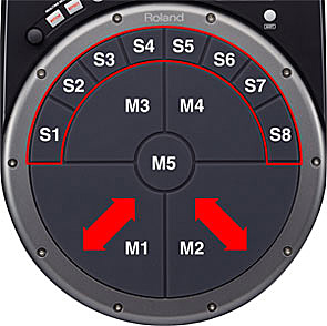 ▲演奏の中心となるパッド部は、メイン・パッド(M1~M5)とサブ・パッド(S1~S8)に13分割。手前の2つのパッド(M1、M2)は、叩く場所によっても音色が変化する。プレッシャー・センスでたとえばM1を押し込みながらM2を叩くと、音が短く(ミュート)なったり、音程(ピッチ)が上がったりする。