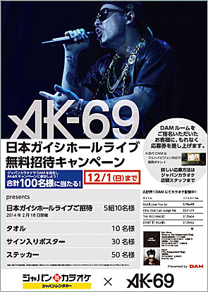 ジャパンカラオケでDAM を指名しAK-69キャンペーンに参加しよう! 合計100名様に当たる!