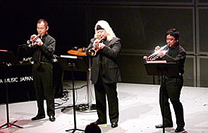 ▲イベントのオープニングとなるステージは新世代Xeno誕生記念としてAllen Vizzutti(アレン・ヴィズッティ)氏作曲による“Xeno Fanfare”でスタート。演奏は世界初演メンバーとなるエリック・ミヤシロ(1st/写真中)、菊本和昭(2nd/右)、佛坂咲千生(3rd/左)。菊本・佛坂の両氏によるXenoシリーズ新モデルと前モデルの比較なども実演された。
