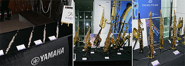 ▲プロフェッショナルシリーズフルート“Finesse”(写真左)、カスタムアルトサクソフォンYAS-82ZやカスタムテナーサクソフォンYTS-8Z2(中)など新製品が並ぶ展示。右のソプラノサクソフォンYSS-82ZなどとあわせCustom Zシリーズがずらり揃う。