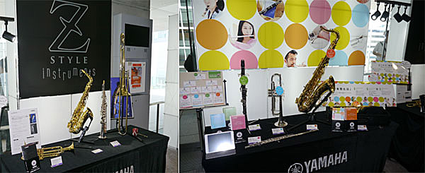 ▲ジャズやポップスで活躍するバンド系管楽器「Z系楽器」(写真左)や、これから管楽器を始める「はじめてさん」向けの楽器や店頭用パンフレットなどの展示も。