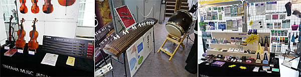 ▲アルティーダ、キーフェレイズ、サイレントバイオリンはヤマハカーボン弓とともに展示(写真左)。琴や和太鼓(中)、メトロノームやチューナー、お手入れ用グッズなど学校向けの製品も幅広く用意された展示スペース。