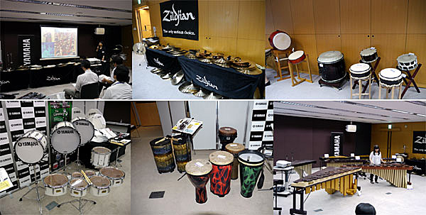 ▲打楽器分科会ではジルジャンシンバル講座(写真左上)やマリンバ/シロフォン/グロッケンなどの音板打楽器講座(右下)などが開催。和太鼓やマーチング用打楽器や、参考出品のVersaのジャンベ/チンバウ/トゥバーノなど(下中)の展示も。