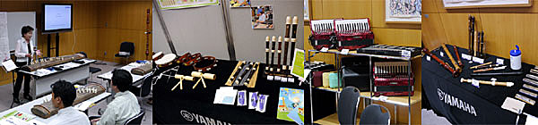 ▲教育楽器分科会ではおことの授業を提案。その仕組からだれでもカンタンにきれいな音で弾けることをアピール。リコーダーやアコーディオン、ハーモニカの展示も。