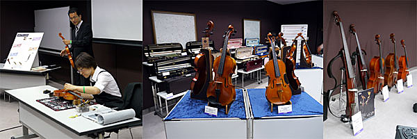 ▲数多くのバイオリンが並ぶ弦楽器分科会ではセットアップ・調整の実演(写真左)などが実施。サイレントバイオリンやサイレントベース/チェロ(右)、ケースやカーボン弓、肩当てなど幅広いラインナップが揃う。