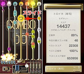 ゲームの操作方法は、画面を流れてくるさまざまな色の玉である「ボカロダマ」を、指先で左右にスライドして、同じ色のパイプの上に重ねるだけ。操作に成功すれば正しい音程で歌いスコアが加算。失敗すると間違った音程で歌う。連続で成功するとコンボとなり、さらに成功が続くとフィーバー状態となって、より高いスコアを目指せるという寸法。また、ランダムで出現するアイテム「キャンディ」を同じ色のパイプの上に重ねると、一定時間、通常より高いスコアを獲得できるようになるというフィーチャーも。