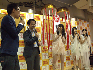 この日のステージにはタワレボのレギュラー番組「南波一海のアイドル三十六房」で総合司会を務める南波一海が司会として登壇。ステージに立ったモーニング娘。メンバーの中からリーダーの道重さゆみがタワレコ新宿店店長の花野氏と一緒に15周年を祝うくす玉を割り、お祝いムードの中でトークを繰り広げた。