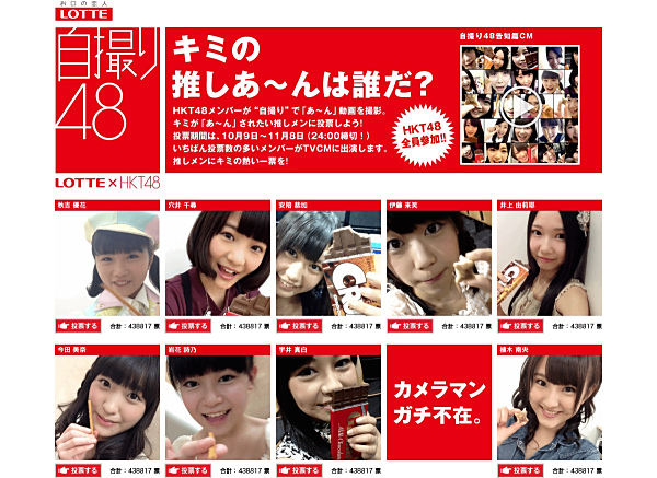 ロッテとHKT48による『LOTTE×HKT48「自撮り48」』 キャンペーンが10月9日よりYoutube配信をスタート。そして動画配信に合わせ、全メンバー39名分の「あ~ん」動画を一挙に紹介したTVCM「自撮り48告知」篇を10月11日より全国へ放映開始した。