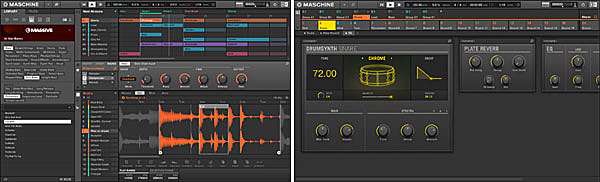 ▲MASCHINE 2.0の画面。シーケンスやサンプルのエディット(写真左)やドラムシンセ(右)のサウンドメイクも本体のつまみで直感的に行える。