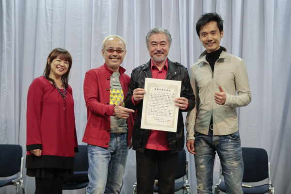 日本オーディオ協会の校條会長から大使任命状が読み上げられ、リーダーの野呂に授与。そして高級ヘッドフォンが記念品としてメンバー全員に授与された。