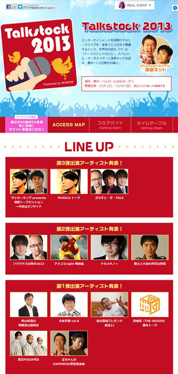 <Talkstock2013>は、11月9日(土)、10日(日)に開催される「TOUCH!WOWOW 2013 ひらけ!9Doors」のひとつの挑戦として開催されるもので、エンターテインメントを深堀りするトークライブを音楽フェス形式で実施するもの。スペシャルオーガナイザーに浅草キッドを迎え、人気トークライブが一堂に会する史上初(?)のスペシャルイベントだ。