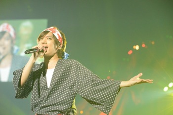 狂騒の口火を切ったのは今回、全公演に出演のDAIGO。今春から初秋にかけて日本中がフィーバーしたあの国民的連続ドラマのテーマソングが流れ、2013年流行語大賞候補の筆頭ともなった決めゼリフを合図に現われた“DAIGOちゃん”に、場内は一瞬にして興奮のるつぼと化した。本人曰く「どう見てもお祭り好きな30代のおじさん」だそうだが、なかなかどうしてスラリと伸びた美脚がまぶしい。「今日はトップバッターなんで気合い入れて盛り上げていかないと。ぜひ、みなさん、DAIGOの時間を楽しんでいってください。よろしく!」と最新のソロ楽曲「無限∞REBIRTH」「いつも抱きしめて」に加え、自身のバンドBREAKERZの曲も披露。一気に場内の温度を上げ、見事先鋒の務めを果たした。