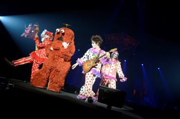 温まりきったオーディエンスにMUCCの奏でる怒濤のヘヴィネスが容赦なく襲いかかる。2012年の<HALLOWEEN PARTY 2012>には逹瑯がHALLOWEEN JUNKY ORCHESTRAの一員として参加していたが、バンドとしては今回が初参戦。前日の飛び入りサプライズの興奮も冷めやらぬ中、ピエロのメイクで登場した彼らは1曲目にリリース前の新曲「World’s End」を演奏、しかも本家というべきポンキッキのキャラクター・ムックとの共演を果たし、のっけからテンションの高いパフォーマンスで場内の空気を我がものとする。「2012年、個人でセッションに出させてもらいまして、ちょっとこりゃ仮装じゃ勝てへんぞ、ということで本物を呼んでみました」とは逹瑯の弁だが、仮装はもちろん、ハード・エッジなバンド・アンサンブルも、タフな艶をたたえた歌も、唯一無二以外の何ものでもない。